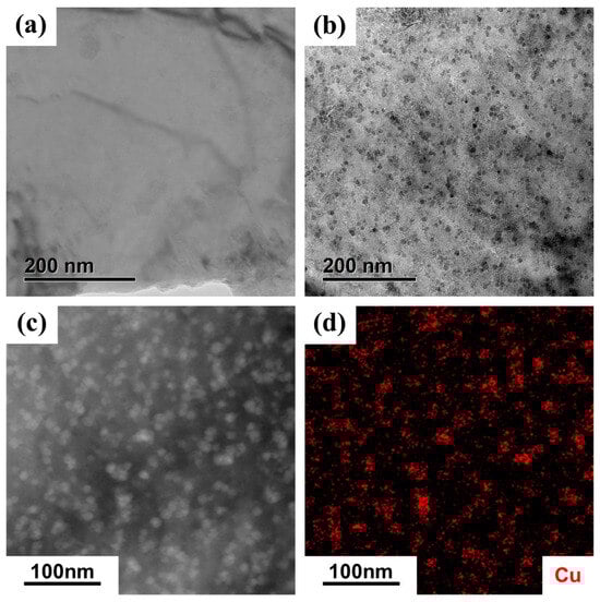 Figure 6 shows the TEM observation results of ST and IA-100h states. In Figure 6a,b, the ST specimen demonstrated no signs of precipitates, while many nanoscale dark precipitates with a particle size ranging from 5 to 15 nm formed in the α-Fe matrix after aging for 100 h. Overall, the CRPs appeared in a relatively uniform distribution, while some agglomerated precipitates were observed. The nanoscale precipitates were determined to be Cu-rich according to the results of high angle annular dark field (HAADF) image and elemental analysis, shown as Figure 6c,d.