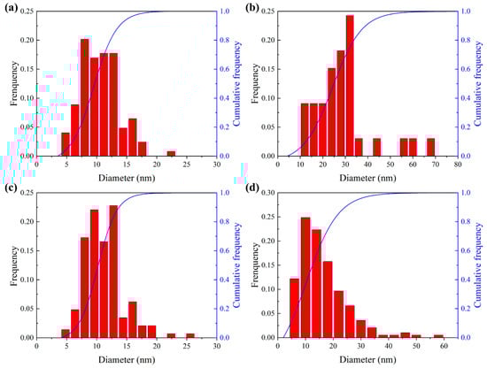 Size distributions of the CRPs in different states: (a) IA-100h; (b) AT-5h; (c) EPT + RA-100h; (d) AT-5h + RA-100h.
