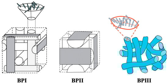 Blue phases are of particular interest because they have a frustrated structure that is stabilized by lattice defects [1,2,3,4,5,6,7,8,9,10,11,12]. Generally, they appear in a very narrow temperature range (less than 2 K). Blue phases consist of double-twist cylinders (DTCs). Molecules are twisted from –45° at one end to 45° at the other end within each cylinder. They are classified into three categories depending on the cylinders’ packing structure: blue phase I (BPI), blue phase II (BPII), and blue phase III (BPIII) (Figure 1) [6]. BPI and BPII have a body-centered cubic structure and a simple cubic one, respectively [2,13]. The lattice parameter for BPI is one helical pitch, whereas that for BPII is a half-pitch. On the other hand, BPIII is thought to have an amorphous structure.
