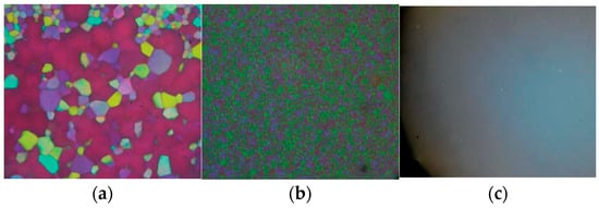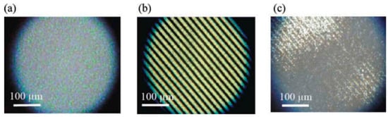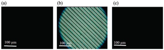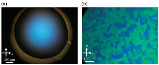 First of all, let us show the textures of blue phases. Figure 2a,b are optical textures of BPI and BPII under crossed polarizers, respectively. The platelet textures are characteristic of cubic BPs. Both BPI and BPII have cubic structures with lattice parameters of approximately visible wavelengths. Therefore, several selective reflection wavelengths correspond to various crystal planes. Figure 2c is a foggy texture of BPIII. The cubic BPs were actively investigated by several experimental methods, such as the Kossel diagram technique [39,40], and are well understood. By contrast, the structure of BPIII remains to be solved.