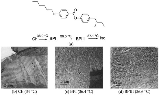 (a) Molecular structure and transition temperatures of CE4. The authors referred that CE4 is a British Drug House designation for chiral 4-(2-methylpentylphenyl)-4′-hexyloxybenzoate, though CE4 is generally used as the abbreviation for chiral 4-(2-methylbutyl)phenyl 4-hexyloxybenzoate. We show here the molecular structure of (S)- 4-(2-methylbutyl)phenyl 4-hexyloxybenzoate. (b) TEM image of a freeze-fracture replica of CE4 quenched from the Ch phase at 34 °C to –190 °C. (c) That quenched from the BPI at 36.4 °C. (d) That quenched from the BPIII at 36.6 °C. Reprinted with permission from [45]. Copyright (1996) American Physical Society.