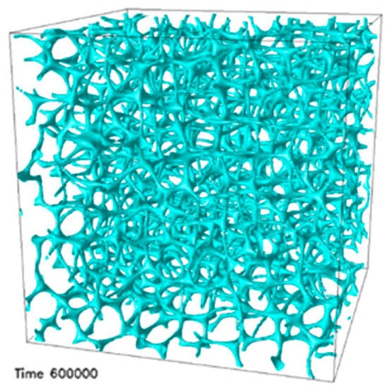 The structure of BPIII has remained unresolved, despite much effort. Recently, Henrich et al. reported that BPIII is an amorphous network of disclination lines, which is thermodynamically and kinetically stabilized over cubic BPs at intermediate chiralities by using large-scale simulations of the blue phases of cholesteric liquid crystals [23]. Aperiodic structures are generated by placing a localized nucleus of BPI or BPII in a cholesteric matrix. For low chirality, the initial defects washed out to leave a cholesteric phase. For a large regime of intermediate chiralities, the dilute double-twisted regions grow and rearrange dramatically to form a whole network of disclinations, which very slowly creeps to an amorphous end state (Figure 4). The authors propose that an amorphous disclination network is locally close to BPII.