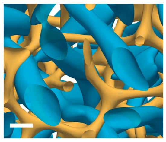 More recently, two interesting simulation studies on BPIII have been reported. The study reported by Paul and Saha supports the theoretical proposition of the spaghetti-like arrangement of the double-twist cylinders as a model of BPIII [24]. Pišljar and Muševič et al. reproduced the bulk BPIII of mutually enmeshed structures of singular defect lines (yellow) and skyrmion filament-DTCs (Figure 5) [46]. They concluded as follows. BPIII is a topologically protected liquid of strongly fluctuating skyrmion filaments with special dynamics. The basic building units of BPIII are the skyrmion filaments. They form highly dynamic, topologically charged entities, which cannot be annihilated due to the elastic energy barrier.