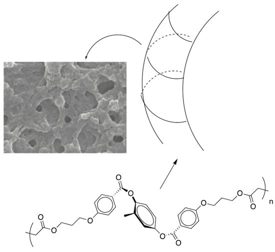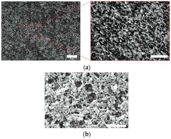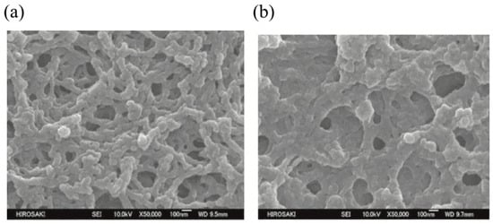 (a) FE-SEM image of the polymer network derived from BPII and (b) that derived from BPIII. The photographs are taken from [50]. Copyright (2023) Taylor & Francis.