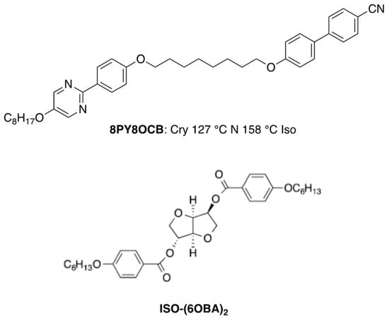 There are two approaches to widening the BP temperature range, as described in Section 1. The first is forming a defect-free state using polymers [25,34,52] or nanoparticles [53]. The other approach is molecular design of BP LCs stabilizing DTC structures. Blue phases consisting of DTCs inevitably accompany defects. If the free energy increase caused by the defect formation is compensated, BPs with a wide temperature range can be obtained. Kitzerow et al. produced polymer networks exhibiting a blue phase structure at room temperature by in situ photopolymerization of mixtures containing a chiral and a non-chiral diacrylate [54]. Kikuchi et al. performed polymer stabilization using a reactive mesogenic monomer [25]. Polymer stabilization has been applied not only to cubic BPI but also to amorphous BPIII [14,49,55,56]. Let us introduce our results here [14]. We used a BPIII mixture containing a small amount of dimeric LC with an even-numbered methylene spacer (8PY8OCB) for the polymer stabilization. The components of the sample were 64.2 wt% of a nematic mixture, 3.4 wt% of 8PY8OCB, 11.9 wt% of a chiral compound ISO-(6OBA)2, 20 wt% of a binary monomer mixture (RM257 (50 wt%) and C12A (50 wt%)), and 0.5 wt% of DMAP. The nematic mixture consists of 4-pentyl-4′- cyanobiphenyl (50 wt%), 4-octyloxy-4′-cyanobiphenyl (35 wt%) and 4-pentyl-4′’-cyanoterphenyl (15 wt%). Molecular structures of the dimeric LC and ISO-(6OBA)2 are shown in Figure 10. The phase transition temperatures of the BP mixture were Iso 75.2 °C BPIII 71.5 °C N* and those of the sample after photopolymerization were Iso 80 °C BPIII. No further phase transition was observed until 0 °C. Doping a small amount of 8PY8OCB to the low-molecular-weight blue phase LC increases the Iso–BPIII transition temperature. The PS-BPIII showed electro-optical behavior characteristic to BPIII.