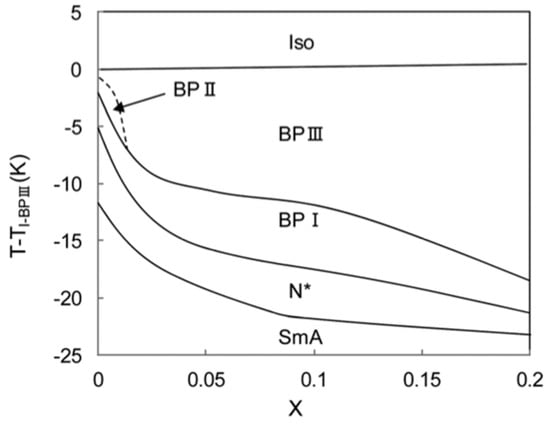 Nanoparticles have been used for stabilizing BPIII. CdSe nanoparticles, where the surface was treated with oleyl amine and trioctyl phosphine, were mixed with a chiral LC: (S)-4-(2-methylbutyl)phenyl 4′-octylbiphenyl-4-carboxylate (CE8). The mixture exhibited a phase sequence of Iso–BPIII–BPII–BPI-N*–SmA* [57]. The temperature vs. composition phase diagram is shown in Figure 11. The Iso–BPIII transition temperature remains almost the same as that of CE8 for all the studied mixtures. The BPIII–BPI and BPI–N* transition temperatures decrease markedly with increasing x. The temperature range of BPIII is 20 K at x = 0.20. The aggregation of nanoparticles at disclination lines might stabilize BP III.