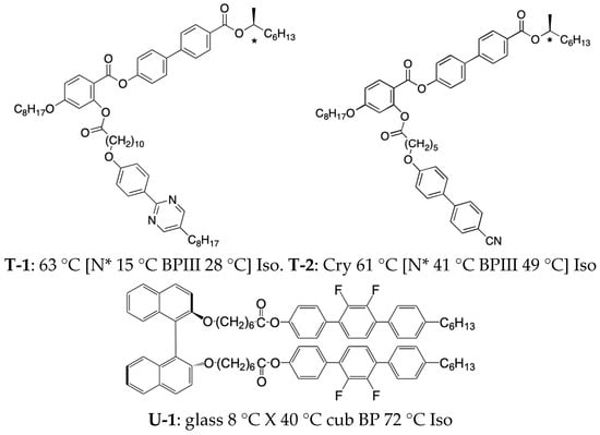 In a low-molecular-mass system, amorphous BPIII was firstly stabilized by a chiral T-shaped compound (T-1) [58] (Figure 12). Compound T-1 exhibited BPIII with a temperature range of 13 K on cooling. Sato and Yoshizawa introduced a polar group into a chiral T-shaped system to couple the molecule with an electric field and subsequently prepared compound T-2 possessing a terminal cyano group exhibiting BPIII and N* phased on cooling (Figure 12). It showed high-contrast electro-optical switching in BPIII [37]. T-shaped compounds stabilize BPIII, and the effect of BPIII stabilization is explained in terms of molecular biaxiality [9,58]. A dielectric study of T-2 in Iso and BPIII revealed that two different modes of rotation around the short axis can exist [59], supporting the inference that the molecular biaxiality stabilizes DTCs in the BPIII. On the other hand, a U-shaped binaphthyl derivative U-1 exhibited a cubic BP with 32 K [60] (Figure 12). Although both T-shaped and U-shaped compounds have a molecular biaxiality, the more flexible T-shaped compounds stabilize BPIII.