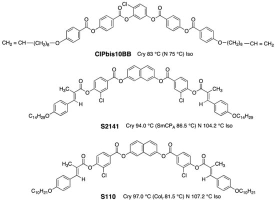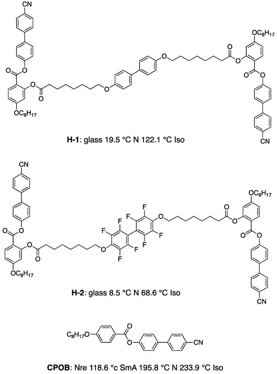 - Sayama, S.; Yoshizawa, A. Achiral H-shaped liquid crystals exhibiting an electric-field-induced chiral nematic phase. J. Mater. Chem. C 2019, 43, 8865–8868. [Google Scholar] [CrossRef]