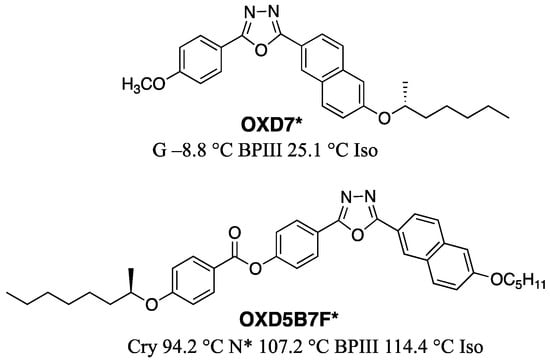 Chiang and Lin et al. synthesized two chiral 1,3,4-oxadiazole-based bent-core LCs (OXD7* and OXD5B7F*) that display BPIII (34 K and 7 K, respectively), as shown in Figure 20 [64]. The authors noted that the HTP and the molecular biaxiality are important factors for stabilizing BPIII.