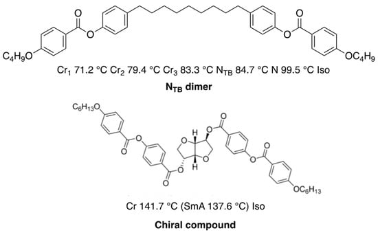 Molecular structures and phase transition temperatures of the NTB dimer and the chiral compound.