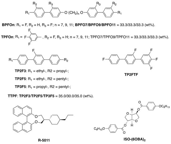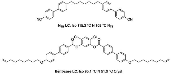 - Archbold, C.T.; Davis, E.J.; Mandle, R.J.; Cowling, S.J.; Goodby, J.W. Chiral dopants and the twist-bend nematic phase-induction of novel mesomorphic behaviour in an apolar bimesogen. Soft Matter 2015, 11, 7547–7557. [Google Scholar] [CrossRef]