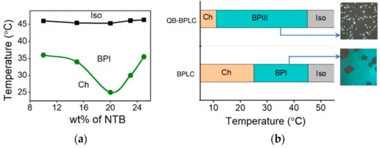 (a) Dependence of NTB LC concentration on the thermal range of cubic BPI. The concentration of S-811 was kept constant at 45 wt%. (b) The phase sequence of the BPLC and QD-BPLC mixtures. The BPLC mixture consists of 45 wt% of S-811, 20 wt% of NTB LC, and 35 wt% of a commercial nematic mixture. The QB-BPLC mixture is a BPLC mixture doped with 0.005 wt% of QDs. Reprinted with permission from [68]. Copyright (2023) Royal Society of Chemistry.