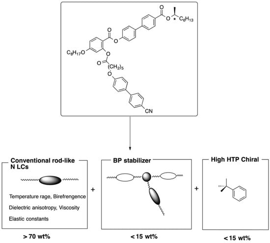T-shaped LCs, H-shaped LCs, or bent-core LCs can be a host material that is transformed to BPIII LC by adding a chiral dopant. However, they increase the viscosity in their BPIII to result in slow electro-optical switching. We proposed a ternary system consisting of a rod-like nematic mixture, a BPIII stabilizer, and a chiral dopant [9,38]. The design concept is shown in Figure 24. Physical properties such as temperature range, dielectric anisotropy, and viscosity are adjusted for the formation of the nematic mixture. The BP stabilizer has biaxiality to stabilize DTCs and flexibility to induce disorder in the system. A rod-like nematic LC mixture doped with such a BPIII stabilizer might be a host LC, which is converted to BPIII LC by adding a chiral dopant with high twisting power.