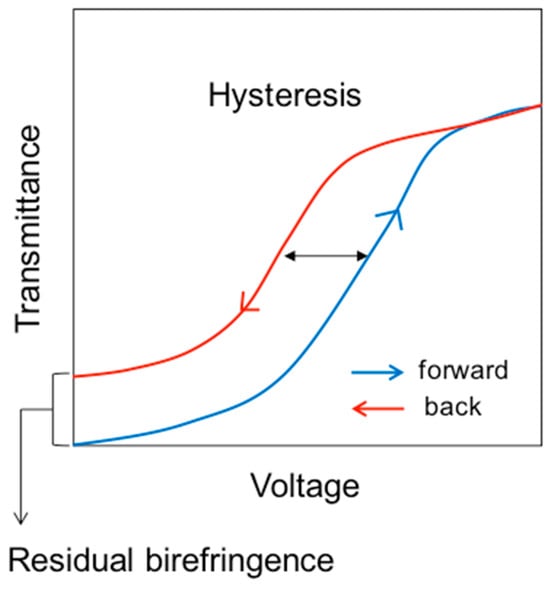 Compared to traditional nematic liquid crystal displays, BPLCDs have the following advantages [34,69]: (1) they require no surface alignment; (2) their response time is in the submillisecond range; (3) their viewing angle is wide and symmetric; and (4) they have cell-gap insensitivity. On the other hand, high operating voltage, hysteresis [36], and residual transmittance have been pointed out. Figure 25 shows hysteresis and residual birefringence in a voltage–transmittance curve. The hysteresis affects the accuracy of grayscale control. Two major approaches to improve device configuration have been undertaken: (1) vertical field switching (VFS) [70] and (2) fringe field switching (FFS) [71]. Both methods also decrease the driving voltage. A low voltage (<10 V) and submillisecond response PS-BP device with VFS has been demonstrated [70].