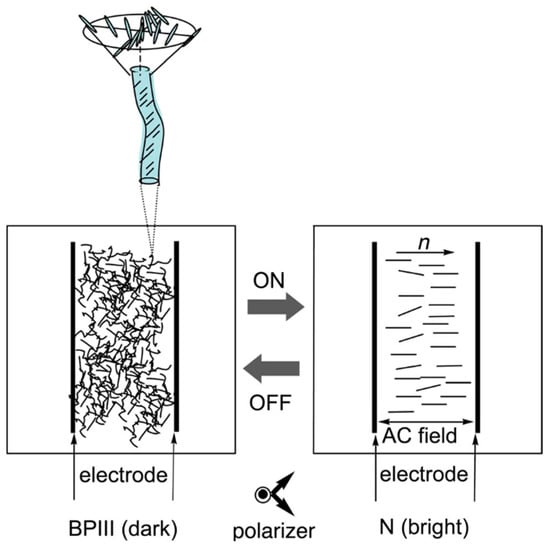 Electric field effects on BPIII have been reported in few studies [5,72,73]. Yang and Crooker investigated a temperature–electric field phase diagram in a BP mixture showing BPIII. The BPIII became a new phase (BPE) at E > 2 V µm−1 [73]. We demonstrated the high contrast electro-optical switching in BPIII due to electric-field-induced phase transition from BPIII to N for the first time [37]. A well black state is obtainable in BPIII without surface treatment, and a homogeneous bright state is achieved in the electric-field-induced N phase [37,74]. Figure 26 presents a schematic representation of the electric-field-induced phase transition between BPIII and N. BPIII has DTCs existing randomly and appears to be macroscopically isotropic. The applied electric field transforms the double-twisted molecular organization to the anisotropic nematic orientation. Once the electric field is removed, the molecules return to form the double-twist organization in BPIII.