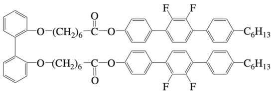 A lot of research has been performed to widen the blue phase temperature range [9,10]. The formation of DTCs inevitably accompanies line defects because the constituent molecules cannot fill the space uniformly. The existence of the line defects increases the free energy of the system. Many attempts have been made to stabilize BPs by forming a defect-free system or by stabilizing double-twist structures. There are two pioneer works on obtaining BP with a wide temperature range. Kikuchi et al. reported polymer-stabilized BPI in which the temperature range was extended to 60 K [25]. With respect to the molecular design of BPs, Coles and Pivnenko reported that a nematic mixture of bimesogenic compounds doped with a small quantity of a chiral additive showed BPI of an extremely wide temperature range (40 K) [26]. In addition, hydrogen-bonded assemblies for stabilizing cubic BPs were reported [27,28]. Although many BP materials have been developed, a clear structure–property relationship in molecular design for BPIII has not been still established.
