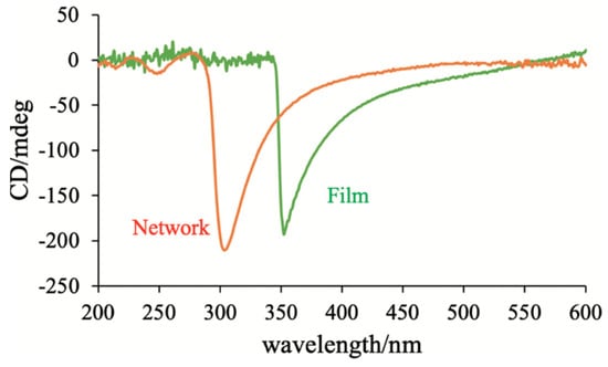 CD spectrum of the polymer network derived from the defects of the BPIII (red) and that of the polymer film obtained by polymerization with the polymer network as a template (green). Reprinted with permission from [50]. Copyright (2023) Taylor & Francis.