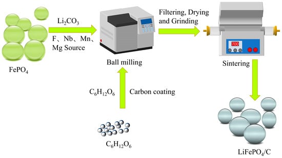 The studied LFP/C cathode materials were synthesized using the ball milling method coupled with a heat treatment. Firstly, the precursors FePO4 and Li2CO3 (calculated as 5% excess, Macklin, Shanghai, China, 99%); various dopant sources, including LiF (Macklin, Shanghai, China, 99%), Mn (CH3COO)2·4H2O (Macklin, Shanghai, China, 99%), and C10H5NbO20·xH2O (Aladdin, Shanghai, China, 99%); and the carbon source of glucose (Macklin, Shanghai, China, 99%) were placed in a ball milling jar, along with an appropriate amount of ethanol(Lanyi, Beijing, China, 99.8%) as a dispersant. The mixture was ground at a speed of 400 r/min for 12 h, filtered, and dried overnight at 80 °C. The dried filter cake was thoroughly ground for 40 min in a mortar and sieved (200 mesh). This powder was transferred to the OTF–1200X tube furnace for initial calcination at 300 °C for 3 h in an Ar atmosphere, followed by a secondary heat treatment at 700 °C for 7 h. The heating/cooling rate of the calcination process was 5 °C/min, and the gas flow rate was maintained at 0.5 L/min. The resulting modified materials were labeled as LFP/C and LFP/C–Xn, respectively (X is the dopant element, and n is the ratio of molar fraction of the doping element, X = F, Mn, Nb, and Mg). The preparation process of the LFP/C cathode materials is illustrated in Figure 1.