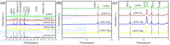 (a) XRD patterns of LFP/C and LFP/C modified by doping with different elements, (b) the zoomed–in patterns in the 2θ range of 10–20°, and (c) the zoomed–in patterns in the 2θ range of 30–40°.
