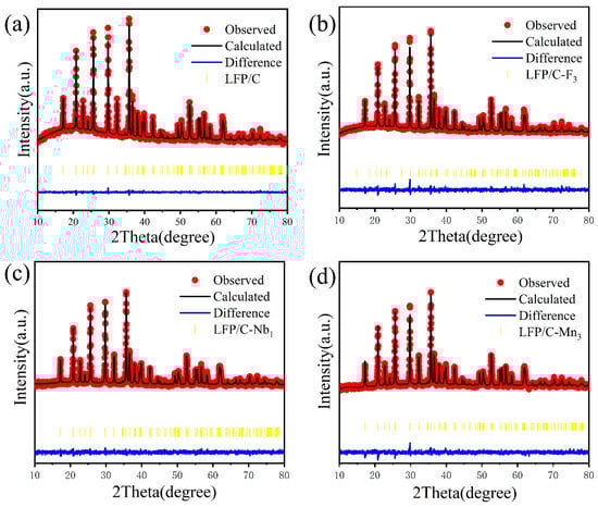 Rietveld refinements of the XRD patterns of (a) LFP/C, (b) LFP/C–F3, (c) LFP/C–Nb1, and (d) LFP/C–Mn3 samples.