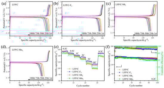 Galvanostatic charge–discharge curves of (a) LFP/C, (b) LFP/C–F3, (c) LFP/C–Nb1, and (d) LFP/C–Mn3 samples at different cycles. (e) Rate performance of LFP/C and doped modified LFP/C cathodes between 2.5 and 4.2 V (25 °C) and (f) cycling performance at 0.2 C.