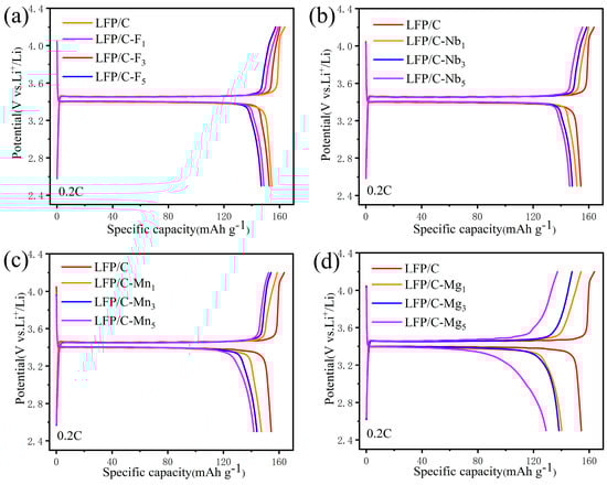 The charge–discharge curves of (a) LFP/C–Fn, (b) LFP/C–Nbn, (c) LFP/C–Mnn, and (d) LFP/C–Mgn cathodes at 0.2 C.