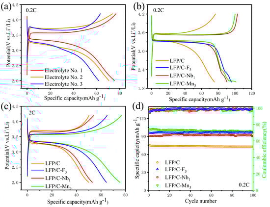 To investigate the effect of different doping elements on the low–temperature capacity of LFP/C cathode materials, LFP/C cells were assembled using three different electrolytes (electrolyte No. 1, 2, and 3) [46,47,48], which underwent charging and discharging assessments at −15 ℃. Electrolyte No. 1 contained 1M LiPF6 in PC: EC: EMC = 1:1:4 Vol%. Electrolyte No. 2 was composed of 1M LiPF6 in EC: EMC = 3:7 Vol% + 1%VC, and electrolyte No. 3 consisted of 1M LiPF6 in DMC: EC: EMC = 1:1:1 Vol% + 1%VC. Figure 7a depicts the charge–discharge curves of LFP/C batteries at −15 °C at 0.2 C, and the battery assembled with the No. 1 electrolyte demonstrated the highest discharge capacity of 79.4 mAh g−1. The battery using the No. 2 and No. 3 electrolytes had reduced capacities of 72.2 mAh g−1 and 62.5 mAh g−1, respectively. These findings suggest that the optimized electrolytes can significantly boost the capacity of the doped LFP/C cathodes. Therefore, all subsequent low–temperature performance tests were conducted using the No. 1 electrolyte. Figure 7b demonstrates the charge–discharge curves of LFP/C and LFP/C–Xn at 0.2 C, where the highest discharge capacity was achieved by LFP/C–Mn3, reaching 102.8 mAh g−1 at −15 °C. Figure 7c shows the cycling performances at 2 C, with the LFP/C–Mn3, LFP/C–F3, and LFP/C–Nb1 demonstrating improved discharge capacities of 78.4, 63.7, and 57.1 mAh g−1, respectively, over the undoped LFP/C at 50.8 mAh g−1. It indicates that the doping of Mn effectively modified the structure of LFP, giving it some of the performance of the LiFexMn1−xPO4 (LFMP), with the low–temperature performance being superior to that of LFP. Meanwhile, the discharge capacity of LFP/C–Nb1 decayed faster with increasing current density, which is consistent with its rate properties at room temperature. Figure 7d displays the charge–discharge curves for 100 cycles at 0.2 C (−15 °C), highlighting superior cycling performances at low temperatures, with no significant capacity loss after 100 cycles. In particular, LFP/C–Mn3 displayed superior low–temperature discharge capacity and rate performance compared to the undoped LFP/C, LFP/C–F3, and LFP/C–Nb1, suggesting that rational Mn doping can effectively enhance the low–temperature performance of the LFP/C. This is attributed to the fact that with the addition of an appropriate amount of Mn, the material exhibits some of the partial electrochemical properties of the LFMP. Although the LFMP is poor in electrical conductivity, it has better low–temperature performance than that of LFP, which is also consistent with the above test results.