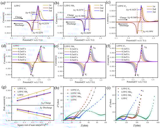 The constant–current charge–discharge tests, CV measurements, and EIS tests were performed on the samples, and the fitting results were analyzed to support the above conclusions. Figure 8a–c and S18a depict the CV curves of the LFP/C, LFP/C–Nb1, LFP/C–F3, and LFP/C–Mn3 between 2.5 and 4.2 V at a rate of 0.1 mV s−1. The data reveal a pair of characteristic peaks that mark Li+ extraction and intercalation phase transitions. The potential difference (ΔE), defined as the difference between the peak oxidation voltage and the peak reduction voltage, provides crucial insights into electrode polarization and the reversibility of redox reactions in materials [49]. A lower ΔE value indicates a lower polarization degree of the electrode reaction and faster Li+ transfer during cycling, thereby improving stability and reversibility [50]. Therefore, it can be concluded that LFP/C–F3 and LFP/C–Nb1 possess superior structural stability and phase transition reversibility [51,52], with their ΔE values in the first cycle (0.199 V and 0.227 V, respectively) being lower than both LFP/C–Mn3 and the undoped LFP/C (0.253V and 0.323 V, respectively). The subsequent ΔE values at the second and third cycles corroborate this finding.