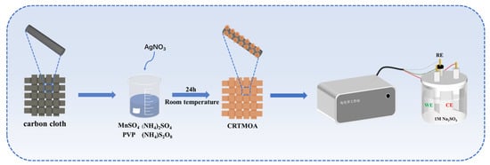 The entire preparation and electrochemical measurement process is shown in Figure 1. Firstly, CC was cut into 2 × 2 cm pieces, washed ultrasonically with deionized water and ethanol for 15 min, and then dried in a vacuum oven at 60 °C. Next, 1.2 g MnSO4, 1.83 g (NH4)2S2O8, 1.98 g (NH4)2SO4, and 0.05 g PVP were added to three beakers containing 40 mL deionized water and stirred evenly. Then, 13.6 mg, 40.8 mg, and 68 mg AgNO3 were added successively, so that the molar ratios of AgNO3 to the final synthesis of MnO2 were 0.01, 0.03, and 0.05. The above-mentioned clean CC was then added, and the reaction was conducted at 25 °C for 24 h. After the reaction was completed, it was washed three times with deionized water and ethanol and filtered through suction, and then the CC attached to the sediment was vacuum dried at 60 °C to obtain the products, which were recorded as CRTMOA1, CRTMOA3, and CRTMOA5, respectively. Due to the low concentration of Ag+, the catalytic effect was relatively poor, and the growth of MnO2 on the CC was not ideal, resulting in there being almost no difference between the quality of CRTMOA1 and the quality of the CC before the reaction. The masses of MnO2 grown on CRTMOA3 and CRTMOA5 were 1.4 mg and 4 mg, respectively.