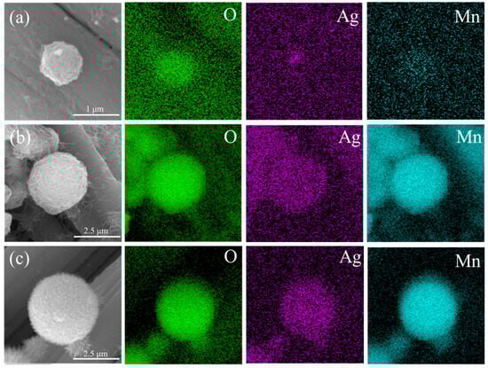 SEM images and EDS images of selected elements: O, Ag, and Mn of (a) CRTMOA1, (b) CRTMOA3, and (c) CRTMOA5.
