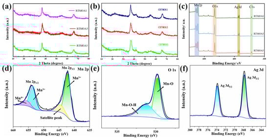 XRD spectra for (a) RTMOA1, RTMOA3, and RTMOA5, and (b) CRTMOA1, CRTMOA3, and CRTMOA5. (c) XPS full spectra for RTMOA1, RTMOA3, and RTMOA5. High-resolution (d) Mn 2p, (e) O 1s, and (f) Ag 3d XPS spectra for RTMOA3.