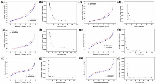 BET analysis of (a) RTMOA1, (c) RTMOA3, (e) RTMOA5, (g) CRTMOA1, (i) CRTMOA3, and (k) CRTMOA5, and pore-size distributions of (b) RTMOA1, (d) RTMOA3, (f) RTMOA5, (h) CRTMOA1, (j) CRTMOA3, and (l) CRTMOA5.
