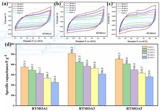 CV curves of (a) RTMOA1, (b) RTMOA3, and (c) RTMOA5, and (d) capacitance values of RTMOA1, RTMOA3, and RTMOA5 at different scan rates in 1M Na2SO4 solution.