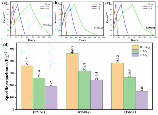 Figure 8 shows the GCD curves of the above three samples, and RTMOA1 exhibits an approximate isosceles triangle shape at all three current densities. The GCD curve shapes of RTMOA3 and RTMOA5 are irregular triangles at 0.5 A/g, and the slopes of the curves begin to slow down when the voltage is about −0.15 V, which is because the material can give full play to the redox reaction at low current density, and the discharge time increases. The specific capacitance values of the three samples at different current densities are shown in Figure 8d, and the overall law is consistent with the specific capacitance calculated using the CV curve. The specific capacitance of RTMOA3 is the highest, reaching 460.7 F/g at 0.5 A/g.