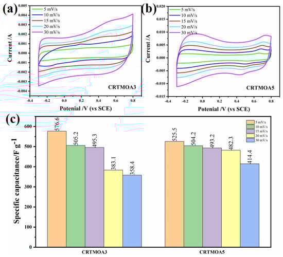 CV curves of (a) CRTMOA3 and (b) CRTMOA5, and (c) capacitance values of CRTMOA3 and CRTMOA5 at different scan rates in 1M Na2SO4 solution.