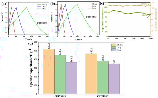 GCD curves of (a) CRTMOA3 and (b) CRTMOA5. (c) Changes in capacitance retention and Coulombic efficiency of CRTMOA3 after 2000 cycles at 1 A/g. (d) Capacitance values of CRTMOA3 and CRTMOA5 at different current densities in 1M Na2SO4 solution.