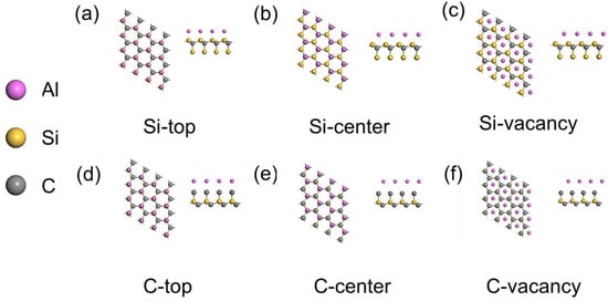 SiC (001)/Al (111) interfacial atomic structure: (a) Si-top; (b) Si-center; (c) Si-vacancy; (d) C-top; (e) C-center; (f) C-vacancy.