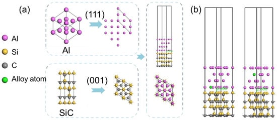 Good interfacial bonding is an important guarantee to improve the properties of metal matrix composites, and the degree of interfacial reaction directly affects the strength of interfacial bonding [1]. Among these composites, SiCp/Al composite materials have good performance in terms of high-temperature resistance, corrosion resistance and high specific stiffness [2,3,4,5,6]. However, there is a serious interfacial reaction at the SiCp/Al interface, and the generated Al4C3 can seriously reduce the strength, elastic modulus, and corrosion resistance of aluminum matrix composites [7]. In addition to the fact that the interface reaction generated at the SiCp/Al interface will reduce the properties of the material, the degree of bonding between the SiCp/Al interface also has a great impact on the mechanical properties of the composite [8,9]. Existing studies have shown that the addition of alloying elements can not only inhibit the SiCp/Al interface reaction to a certain extent but also improve the bonding ability between the interfaces so as to improve the properties of composite materials [10,11]. For example, the addition of Si, Cu, Ti, etc. can inhibit the generation of Al4C3 and improve the mechanical properties of the material by reducing the activity or generating other substances [12,13,14]. However, there are still some deficiencies in the alloying elements added in the current study, such as the lack of explanation based on the atomic perspective for the mechanism of inhibiting the interfacial reaction through the addition of Si atoms in the matrix [15,16]; Cu atoms can form a solid solution with Al to improve the properties of the material, but the effect of their enhancement of the properties of the material is not significant enough, and the introduction of Ti is prone to generate Al-Ti brittle intermetallic compounds with Al, which leads to a reduction in the strength of the material. The introduction of Ti can easily generate Al-Ti brittle intermetallic compounds with Al, resulting in the reduction of material strength [17]. Therefore, it is necessary to expand the research scope of alloying elements and search for more suitable alloying elements within the scope of the periodic table.