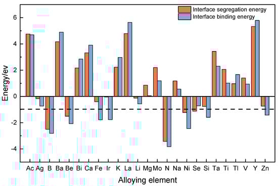 We utilize Equations (4) and (5) to compute the interface segregation energy and interface binding energy for the interface model incorporating additional alloying elements, respectively. The results of the calculations are presented in Figure 4. The red portion represents the interface segregation energy of the model while the blue portion represents the interface binding energy of the model. The value of the dashed line corresponds to the interface binding energy of the model at the SiCp/Al interface. Figure 4 illustrates that eleven out of the twenty-five typical alloying elements exhibit interfacial partial cohesion energies below 0, while eight demonstrate interface binding energies lower than those of the system without added alloying elements. Consequently, the alloying elements determined through first principles are deemed to be significant, and the findings are structured to form the output component of the machine learning dataset.