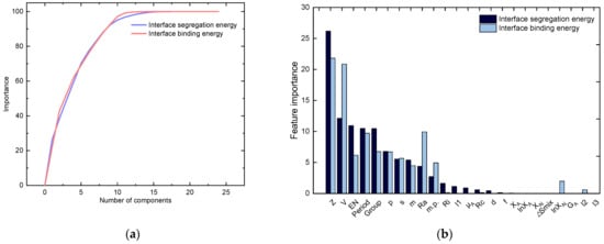 Results of PCA: (a) effect of the number of features on the result; (b) importance of each feature for predicting the output of interface segregation energy and interface binding energy.