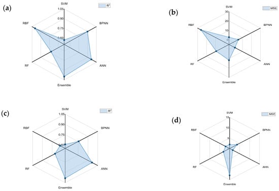The R2 and MSE calculations for each model are shown in Figure 6a, which represents the R2 value of the interface binding energy, and the R2 is sorted thus: RBF > ANN > Ensemble > BPNN > RF > SVM. Figure 6b represents the MSE of the interface binding energy, and the MSE is sorted thus: RBF > RF > Ensemble > BPNN > SVM > ANN. It is found that although the R2 value of the RBF is very large, its prediction value also has a large error with the true value being very large but the error between its predicted and true values also being large. Then, comparing the MSE of its training set and test set, it is found that the error of the training set is only 2 × 10−5 while the error of the test set is 8.95. Therefore, the RBF has an overfitting phenomenon when training on the dataset, and it cannot be used for prediction in machine learning. Comparing the training results of the ANN, not only is the value of R2 larger but also the value of MSE is the smallest, and the difference between the error values of its training set and test set is not much, which means it can be used as a machine learning model for this dataset. After comparison, it is found that the rest of the machine learning methods are good, but the results are still not accurate enough when compared with the ANN algorithm. Figure 6c,d represent the R2 and MSE of the interface segregation energy. It can be found that in the process of calculating the interface segregation energy, the Ensemble method also suffers from the overfitting problem in the calculation of the interface binding energy, and the remaining four methods, namely the RBF, the BPNN, the RF, and the SVM, have a lower degree of fit and larger errors. The ANN is also the optimal choice for the machine learning model to predict the interface segregation energy.