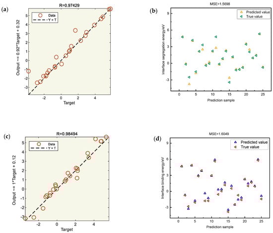 Results of the ANN model: (a,b) R and MSE of interfacial segregation energy; (c,d) R and MSE of interface binding energy.