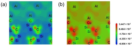 Differential charge density for different interface models: (a) SiCp/Al; (b) SiCp/Al-Cu.