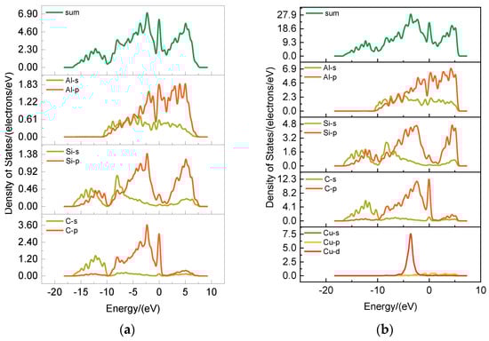 Nine target alloying elements were screened out after the calculation of first-nature principles and machine learning. We choose one of them, Cu, to explain the effect of this alloying element on the electronic structure of the interface from an atomic point of view based on the first-nature principles. Shown in Figure 9 are the differential charge density maps of SiCp/Al and SiCp/Al-Cu systems. The differential charge density was analyzed, and it was found that the addition of Cu atoms to the system caused a great change in the electronic structure of the material system due to the doping of the alloying atoms. When no Cu atoms were added, comparing the similar C and Al atoms, C atoms had a larger negative charge, Al atoms had a larger positive charge, and there were strong ionic-bonding interactions between them, making the material plasticity and toughness deteriorate. Adding Cu changed the above C and Al atoms’ differential charge density distribution, ionic-bonding specific gravity became smaller, and there was more embodiment of the metallic nature, which is conducive to the improvement of composite material brittleness. The fractional-wave densities of states for the SiCp/Al and SiCp/Al-Cu systems are shown in Figure 10. The increase in the values of the densities of states after the addition of the Cu atoms indicates that the electrons cross the Fermi surface and jump from the valence state to the conduction band and that there is a larger interaction between the SiC and Al atoms and the Cu, which further indicates that the system is more metallic. The orbital coupling of the 3d orbitals of Cu with the 2p orbitals of C, Si, and Al, as well as with the 2s orbital of Al, indicates that Cu interacts with all of these atoms. In addition, the orbital coupling between C and Al is weakened by the addition of Cu atoms, which implies that the introduction of Cu inhibits the interfacial reaction to some extent. Therefore, the addition of interface-regulating alloying elements can improve the material properties, control the interfacial reaction, and enhance the interfacial bonding to a certain extent.