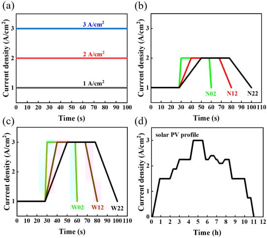 Figure 1. The AST waveforms used in this investigation. (a) The 1, 2, and 3 A/cm2 constant-current density mode tests. (b) Narrow square-wave mode test with fluctuations in the range of 1–2 A/cm2. (c) Wide square-wave mode test with fluctuations in the range of 1–3 A/cm2. (d) Simulating solar PV fluctuation mode within a current density range of 0–3 A/cm2.