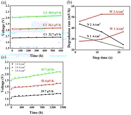 (a) Voltage change at different constant-current density, and the slope of the fitted line represents average degradation rate. (b) The relationship between degradation rate and step time in narrow and wide square-wave tests. (c) Voltage rise in solar at different current densities.