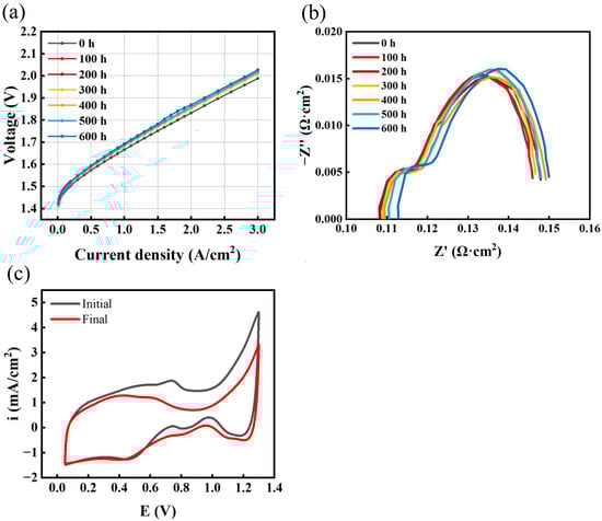 The IV curve in Figure 3a shows that in the part of the current density that is less than 0.5 A/cm2, the polarization curve basically does not change with time, indicating that the electrolyzer performance is stable and less affected by test condition. However, in the region of higher current density, the voltage gradually increases with time. Although during the early part of this investigation the magnitude of voltage values increased and decreased at times, all the values showed a pattern of degradation after 600 h of AST. Figure 3b shows the Nyquist plot of the EIS spectrum at 0.2 A/cm2; the high-frequency impedance decreases in the early part of AST and then increases, which is consistent with the voltage decrease in the polarization curve in the early part of the AST. The initial and final CV curves of the fastest AST for the constant-current mode are shown in Figure 3c. Usually, the area under the CV curve represents the amount of redox charge involved in the electrochemical reaction. The capacitance current will be less than the initial current, and this is a result of the lower performance of the electrolyzer; the same change has been observed in previous studies [,]. The average oxidation and reduction currents of the electrolyzer decreased after the durability test, the catalytic performance decreased, and the degradation was evident in the electrochemical characterization tests.