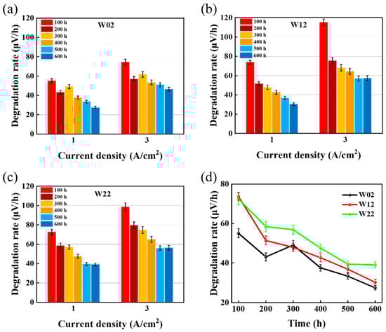 Figure 4 shows the degradation of the three ASTs in wide square-wave mode, with the average degradation rate calculated every 100 h for a total of 600 h of degradation. The average degradation rate at different times of the wide square mode can be seen from Figure 4a–c, except for the 100 h at the beginning of the experiment. Due to other factors, W12 has a faster degradation in the same fluctuation range, and then all of the wide square-wave modes satisfy the pattern that the degradation rate and the current step time are positively correlated. Passivation of Ti tends to occur at high potentials because when the titanium capacitive is passivated and an oxide layer is formed on the surface, the oxide layer prevents the transfer of electrons and ions, leading to an increase in electrolytic resistance, which in turn requires a higher voltage to maintain a certain current density [,]. This will increase the energy consumption and voltage of the electrolysis process. After the titanium plate passivates to a certain degree, the surface oxide layer will not be significantly thickened by the high voltage; that is, the titanium plate reaches a more stable state due to the existence of the surface oxide layer, which enhances the corrosion resistance and electrochemical stability of the titanium plate at the expense of part of the electrode efficiency to obtain the property of long-term stability. However, since this part of the change occurs inside the electrolyzer, there is no study that can accurately describe the mechanism of the change. Some relevant studies have shown that it is possible to plate a layer of titanium plate with a good conductivity line and electrocatalytic activity Pt, the purpose of which is to artificially inhibit the oxidation of the titanium plate and protect the Ti substrate from corrosion passivation with the Pt layer, which can reduce the electrolysis voltage to a certain extent and improve the performance of the electrolytic water by enhancing the stability of the components.