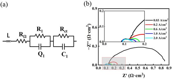 (a) Equivalent circuit model [] and (b) EIS measured at different current densities.