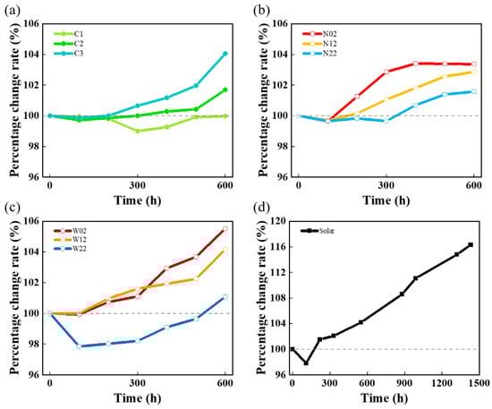 The degradation rates shown in Figure 6a are consistent with common sense, and high current will promote degradation. C1 is special, as the final high-frequency impedance has a very small reduction compared to the start, indicating that the influence of C1 on the titanium plate is small. Alongside this, the membrane and the titanium plate bring about the effect to counteract each other, so the 1 A/cm2 current mode is not able to accelerate degradation. Figure 6b,c shows the percentage change in high-frequency impedance in the square-wave mode, and larger changes occur in the wide square-wave mode, affected by high current. Meanwhile, Figure 6d illustrates that solar simulation would cause more severe corrosion and passivation of the titanium plates, in the form of increased high-frequency impedance.